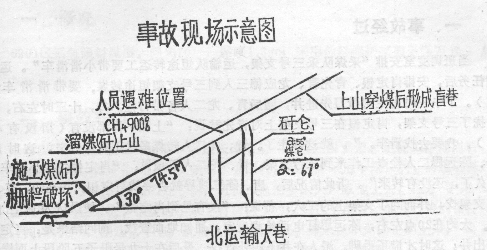 行了”。何夕华说:.“你们在下面注意点,仅防矸石掉下来打到起。”这时何背起保险绳就往上山去了、大约五分钟左右,矸仓里掉了矸石下来,又隔了约五分钟左右,上山内没有动静,陈仕林对吴明科说: “何老头上去没有动静是不是被瓦斯闷倒了?”吴明科就上去看,见上山上面有灯亮着,但嘁不答应,急忙往上爬,约爬了十米左右,觉得心头发慌,头抬不起来,就退下来到碛头喊矿里检查安全的张兴贵、佘大林,瓦检员杨序国来救何夕华。他们三人上行10 m处检查瓦斯推光无法上去,佘大林忙去打电话报告矿调度室。矿救护队10点15分赶到现场,把何抢救下来,急忙进行人工呼吸,但因时过;长抢救无效,牺牲。
