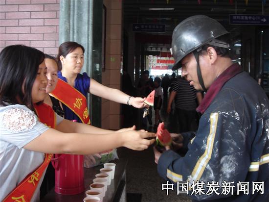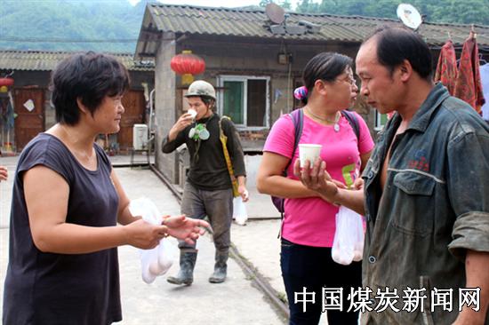 山西阳泉一矿维运工区女工到井口为矿工送清...