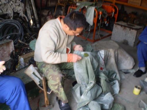 中煤49处注浆公司男职工修补雨衣、雨鞋,做...