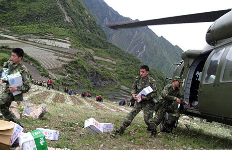 首批救援直升机到达地震震中汶川县城