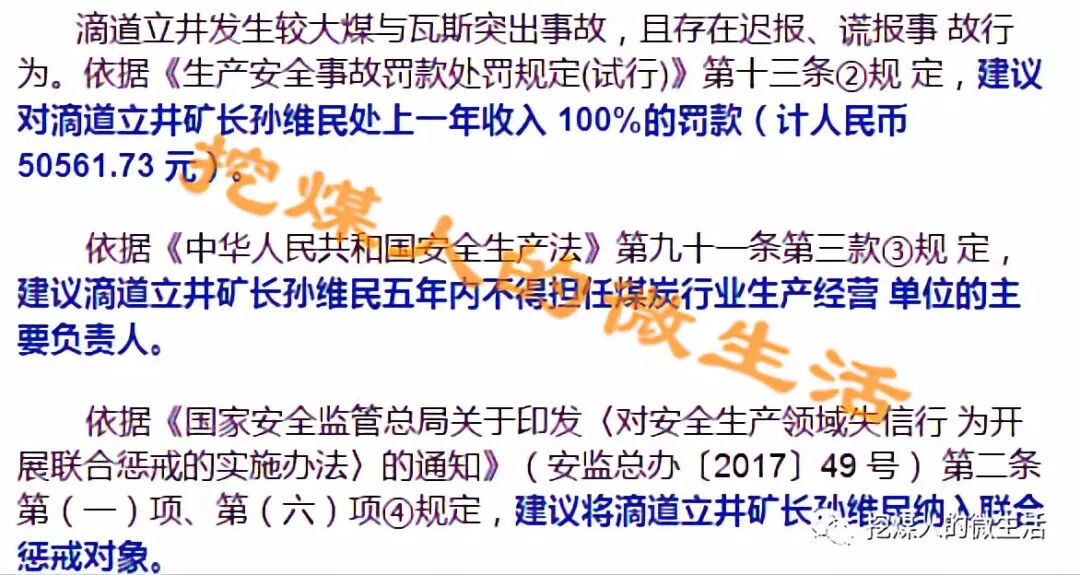 依据《国家安全监管总局关于印发〈对安全生产领域失信行 为开展联合惩戒的实施办法〉的通知》(安监总办〔2017〕49 号) 第二条第(一)项规定,建议将滴道立井纳入联合惩戒对象。
