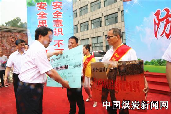 矿长原建军宣布阳煤五矿2019年全国“安全生产月”咨询日活动开始。活动按照顺序进行,集团公司党委副书记、副董事长、总经理王永革,副总工程师、安监局常务副局长赵世铎,矿长原建军,党委书记宁斌共同为安全生产标准化动态达标示范作业地点授牌。