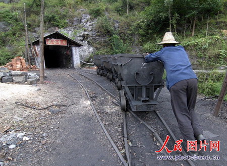 9月9日,一名矿工推煤车到涟源市伏口镇金益煤矿矿里去进行抢险。