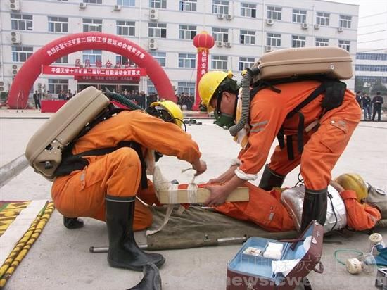 运动会上,救护队进行了矿山救护表演,武保科进行了擒拿格斗表演,旅馆化服务员进行了铺床叠被表演,汽车司机进行了换轮胎表演。选手们娴熟的动作和精湛的技术赢得了现场观众的阵阵掌声。 随后,矿井维修电工、电焊工、矿灯工、监测工、测量工等20个工种的选手分别开展了比赛,在比赛现场,矿领导分别到红白案操作、矿灯修理、皮带接头铆接、防爆电工接线工艺安装、井下瓦斯检测系统安装等现场观看,矿领导每到一处都为选手鼓劲加油,此次比赛还在综机工厂和机修厂设立分赛场进行泵站司机、支架工、钳工、车工等项目的比赛。 2007年是该矿全面落实“一年打基础,二年上台阶,三年创品牌”的战略工作目标攻坚年。矿党政坚持科技兴企的战略目标,坚持以人为本,大力实施“人才兴企”战略,强力推进职工素质工程建设,以职工职业技能大赛为载体,掀起全矿职工“学技术、钻业务、练硬功、岗位成才”的高潮,在全矿职工中形成“全员职工大比武,人人争当‘武状元’”的良好氛围。同时,这次职工技能运动会也是对该矿今年开展的“管理素质年”活动的一次检阅。图为技能比赛现场