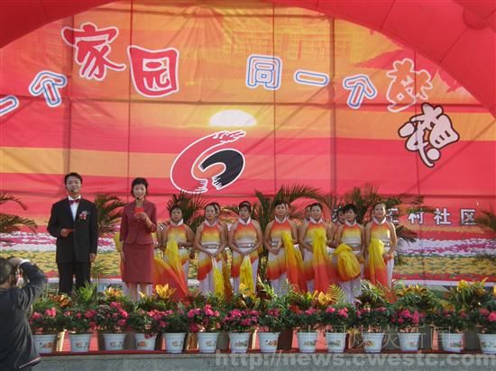 10月18日,王村社区中心花园广场彩旗飘扬,花团锦簇,大红的灯笼高高挂起。在中国农历九九重阳节到来之际,王村社区隆重举办了首届居民大会暨同一个家园同一个梦想、庆十七大文艺演出活动。来自社区干部职工、居民群众,驻社区单位以及应邀参加的物业中心、权家河社区等10个单位的部分职工群众共同演绎了一场精彩的文艺演出,为节日的王村社区营造出浓郁的喜庆气氛。 在喜庆热烈的气氛中,矿区工会主席肖绪才与社区领导为社区9名80岁以上的老寿星颁发了荣誉证书,给他们送去了组织的关怀和节日的祝福。大会还队评选出10名“热心公益好居民”、15户“五好文明家庭”进行了表彰奖励。 随后,驻社区单位及应邀参加活动单位的部分职工群众一道与社区居民同台表演了舞蹈《红红火火》、配乐诗朗诵《走进社区》、独唱《人间第一情》等精彩的文艺节目,演奏出了一曲共驻、共建、共享无比动人的乐章。