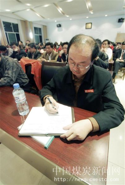 蒲德贵071025-2:石壕煤矿矿长李宗福坐在课堂上认真记录着劳模讲解的先进管理经验。