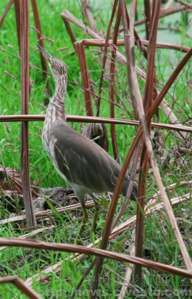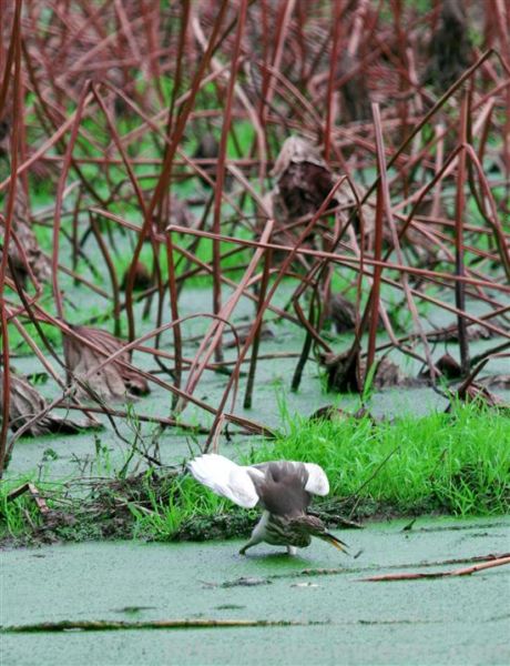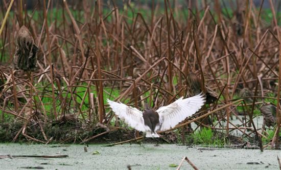 “变色鸟”出现在石壕煤矿矿区,与8000市民朝夕相处。一时间,“变色鸟”的到来成为矿区市民关注的话题,纷纷涌向田间地头,对鸟儿的生活习性进行仔细观察。松藻“太阳石”摄影协会的10多名爱好者也拿出长枪短跑奔赴田间地头,守候在“变色鸟”栖息地,记录着“变色鸟”的一举一动,不断地招呼着来人,“脚步轻一点,别惊扰了‘变色鸟’,给它一个宁静的生活。” “变色鸟”生活习性怪异,飞翔,寻食总是与人保持5米的防范距离。藕田里,棕色的羽毛与残荷极为相仿,不为人发现;飞翔时,总是以白色羽毛来忽悠市民常常以白露飞行的白色羽毛来麻痹观赏市民。 “变色鸟”飞翔时,展开白色羽毛,俯瞰背部身体中央是棕色呈椭圆形;落地时,棕色羽毛包裹着全部身体,脖子段至于胸部呈现向麻花形状斑文,白色与棕色相互衬托,长长的嘴角上下中间呈现粉红色,腿部至脚掌部呈现绿色,眼脸呈绿色等特征,高度40厘米,长度30厘米。 矿区爱鸟土专家左先生说:“我对鸟儿也有研究,就是从来没有见过这样会变色的鸟儿,矿区常常见到的鸟儿无非是八哥、喜鹊、白露、灰鹤、黄金鸟等等,‘变色鸟’光临矿区值得研究。” 据了解,1994年以来,石壕煤矿以“井下抓文明生产,地面抓环保建设”活动,对矿区环境进行绿化,先后被重庆市命名为“环境优美工厂”、“园林式单位”,2006年,被国家环保总局命名为“绿色社区”,生活在矿区的鸟儿近100种。 ![]() 嬉戏。 ![]() 矿区爱鸟市民设立告示过往行人保护野生动物。 ![]() 捕食。 ![]() 警觉。 ![]() 梳妆打扮。 ![]() 呼朋唤友。 ![]() 自由穿行在矿区的荷田间。 ![]() 飞翔田间。 ![]() 在空中,飞翔姿态与白露相似。 ![]() 矿区摄影爱好者关注“变色鸟”。