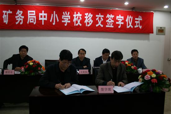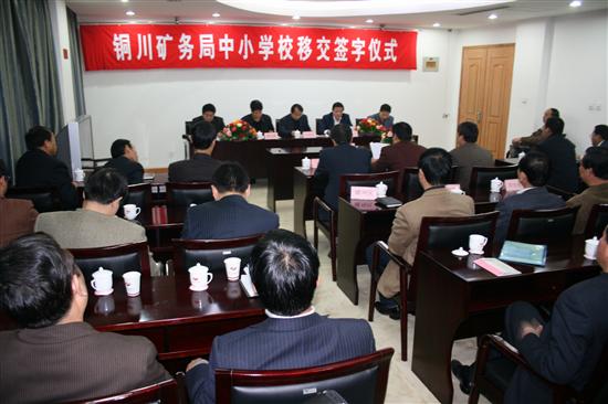过去,铜川矿务局有几十所中小学校,2000多名教职工,数万名学生。企业不论在经济困难还是经济好转的情况下,都竭尽全力为学校和教职工办实事、解难题。在矿务局党政的大力支持下,铜川矿务局一中进入了省级重点中学行列,成为铜川市三所重点中学之一,自恢复高考以来,矿务局一中向清华大学、北京大学等高等院校输送了5000多名大学生。 根据陕西省人民政府办公厅“关于印发省属企业分离社会职能工作实施意见的通知”精神,自去年以来,铜川矿务局在地方各级政府的重视支持下,积极搞好学校移交工作。到11月7日,已基本完成了企业中小学校的移交工作,从去年来,分两批把22所中小学校全部移交给了铜川市王益区、印台区和耀州区,移交在职教职工1279人,离退休教师803人,移交资产6112万多元,移交土地439.18亩。 分离企业办社会职能,是深化国有企业改革,实现政企业分开,提高国有企业竞争力,完善社会主义市场经济体制的重大举措。铜川矿务局党政高度重视此项工作,有关部门认真做好了移交教职工资格认定、资产清产确认、遗留问题处理、在职教职工工资和离退休教师生活费套改、移交人员及资产报批等工作,确保了移交工作顺利进行,保证了学校教学工作有序和管理工作的平稳衔接。铜川矿务局没有因为学校移交地方政府而减少对学校的资金投入,学校移交期间,铜川矿务局还给学校投入了大量资金,改造学校环境,增添教学设备等。 图1为铜川矿务局中小学移交签字仪式现场
