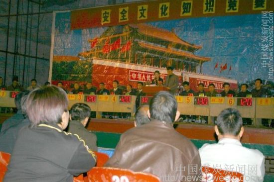 本网讯 为了提高职工的安全意识,推动百日安全活动的顺利进行,陕西铜川矿务局王石凹煤矿于11月7日、8日举行了安全文化知识竞赛活动,全矿所有单位共组织了24个代表队,经过复赛和决赛,有9个代表获奖。在8日早上举行决赛中有400名进行现场观看和观众答题,并不时为选手的精彩答题鼓掌,矿党政领导为获奖单位颁了奖。据了解,这是该矿继日前安全文艺演出进班组后又一次规模较大安全教育活动,旨在于用心动来推动行动,促进安全生产顺利进行。 图一、决赛现场