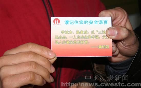 先前,该矿水电科协安分会在所结对子的综采一区职工中,开展了“写出你的安全诺言”征集活动,把所征集到的职工安全诺言,精细编排,按照每一位职工所说的话,属名印制了一张张精美的“请记住您的安全诺言”手持卡片,返回到职工手中。“我在工作中一定要注意安全,只有安全才能够给企业带来效益,只有安全才能够给家庭带来幸福。”综采一区关长明拿着卡片,一遍又一遍地读着自已曾经说过的话,面部上流露出了来自内心深处的真挚动情。 ![]()
