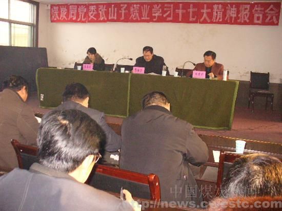 张山子煤业有限公司举办“学习十七大精神报告会”     本网讯  12月18日上午9时,山东枣庄市张山子煤业有限公司举办了“煤炭局党委张山子煤业学习十七大精神报告会”,邀请台儿庄区委宣传部副部长张体华、台儿庄区煤炭工业局副局长张嘉宜作了学习讲座,该公司董事长、党委书记、总经理刘建功主持学习报告会,副科级以上管理干部、全体党员及后勤机关工作人员共计300多人参加了学习。