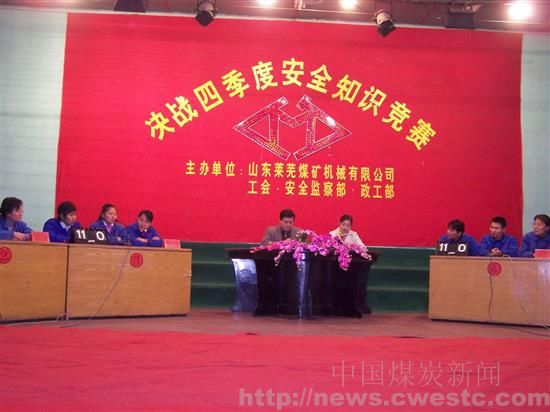 图片新闻:莱芜煤机公司举办“决战四季度安全”知识竞赛     本网讯  12月1日,山东煤机集团莱芜煤机公司工会、安全监察部、政工部联合举办“决战四季度安全知识竞赛”,参加本次知识竞赛的六支代表队是在该公司工会组织的《安全在我心中》书面竞赛答题中平均得分前六名的单位。竞赛采用必答、抢答等五种方式,在轻松热闹的气氛中进行,职工们从中掌握了安全生产知识,进一步增强了“决战四季度,搞好安全生产”工作的信心。