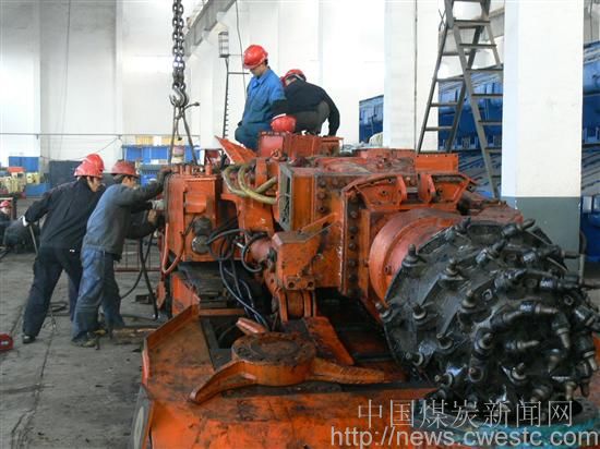 图二为职工正在对已修复的100型综掘机进行组装,打运入井投入使用。