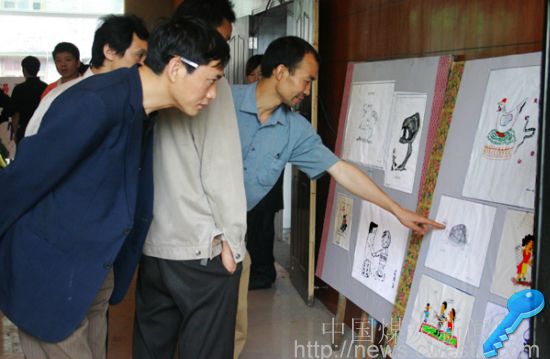 图4:职工们饶有兴致地簇拥在职工自己的安全漫画、安全征文、安全建议展板前,细细品味