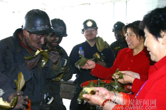图片新闻燕子山矿矿工吃着香甜的热粽子     本网讯:6月19日, 是传统的“端午节”.山西大同煤矿集团公司燕子山矿工会在这天早晨,组织女工家属深入到井口,为一线的矿工送上香甜的热粽子,同时嘱咐矿工们一定要注意安全生产.图为刚上井的矿工在吃着香甜的热粽子.