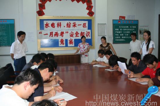 本网讯 在全国安全生产月活动中,淮北矿业临涣矿物业处水电科协安会,与综采一区携手在职工中开展了“一月两考”安全知识有奖竞赛活动,把煤矿安全生产应知应会及相关知识,以试卷形式传授给职工。图为协会在对职工进行现场考试