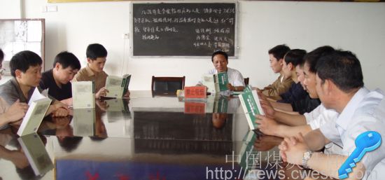 本网讯 为加强新型班组建设,进一步提高班组长从事生产管理的素质和能力,近日,陕西长武亭南煤业公司各区队利用班后会时间,组织班组长进行集体学习。图为:该公司综采队正在学习2007年最新版《煤矿班组 安全基础管理》一书。