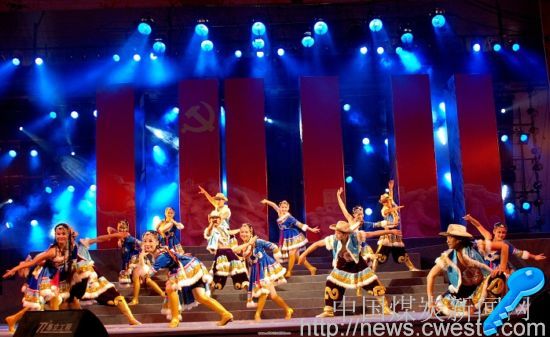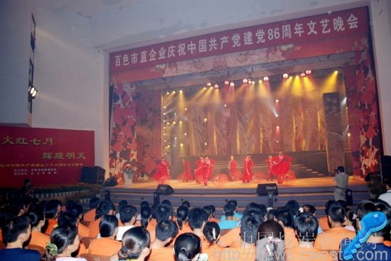 本网讯 6月27日晚,广西右江矿务局影剧院里灯火辉煌,歌声嘹亮,掌声、喝彩声连接不断。以“火红七月,辉煌明天”为主题的百色市九大直属企业庆祝中国共产党建党86周年文艺晚会在这里隆重举行。