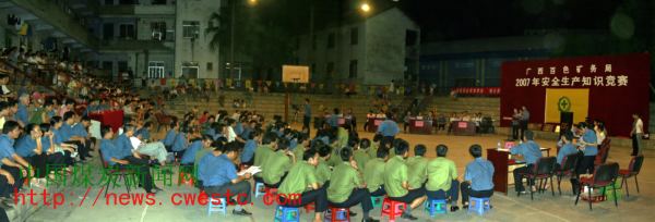 本网讯 为深入开展安全生产月活动,增强职工家属的安全意识,6月29日晚百色矿务局在局机关球场举办2007年安全知识竞赛,全局有8个队参赛,1000多职工家属参加抢答.图为竞赛会场。