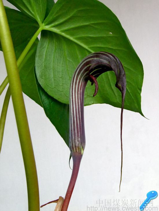 2003年6月中旬,我在野外发现了这朵花。花身颜色褐色与白色条状相间,呈卷筒状,顶端部宛如象鼻,花喙内伸出柱状褐色花蕊。顿感花型奇特鲜见,遂将其挖掘至家中盆栽。至今从未接触直射阳光,茎叶依然肥壮。