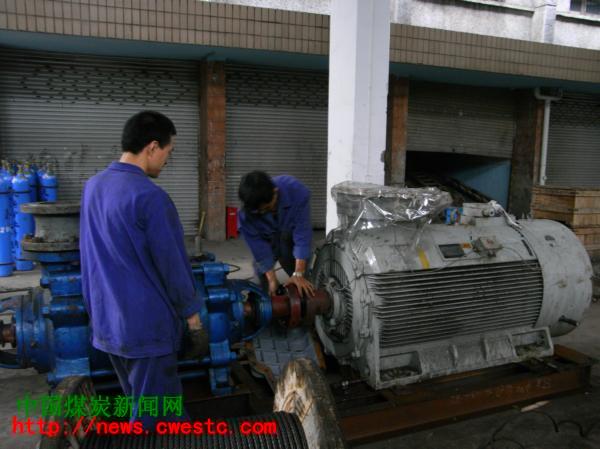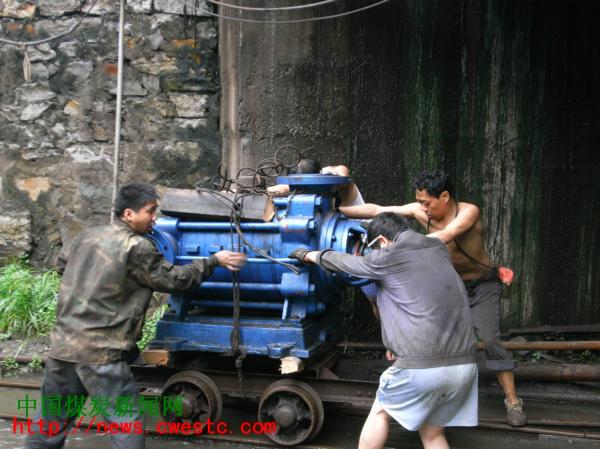 本网讯 正当重庆许多地区正遭遇着百年一遇暴雨袭击的时候,受这一强降雨的影响,重庆磨心坡煤矿井下也遭遇了建矿以来的最大涌水,该矿积极采取措施抗洪,确保矿井安全。 由于连日重庆地区普降暴雨,磨心坡煤矿井下涌水量直线飙升,从7月15日的1500立方米/小时,猛涨到7月20日的2500立方米/小时,此乃该矿建矿以来的最大涌水。-115M水平水泵房原有8台200KW水泵已全部启动,水位仍在上涨,天府矿业公司立即调拨了一台水泵,该矿马上组织机电区员工在-115M水平进行突击安装,9台水泵日运行时间达到216小时,仍不能将涌水排出,-115M水平巷道中许多路段积水已淹过铁轨。而-10M水平主水泵房已开始启动了10台355KW的水泵,日运行时间达到240小时,井下涌水仍在增大。由于井下的超负荷排水,平洞的排水沟已全部灌满,并溢出将大部分铁轨淹没,铁轨中积水一般都在200毫米左右,深的地方近400毫米,特别是洞口处,简直成了一条河。7月19日上午,重庆能源投资集团公司党委书记蒲恒荣、董事长吴连帆先后打电话来关心磨心坡煤矿受灾情况。中午12时,重煤集团杨镜璞总经理也赶到了磨心坡煤矿,在天府矿业公司领导陪同下来到地面车场、洞口等地察看了灾情,并对磨心坡煤矿抗洪工作作了重要指示:首先要确保职工人身安全。其次要采取有力措施,发动全矿职工加入到抗洪中来,决不能淹井。同时,要做好抗大灾的各项准备工作。从7月19日早班开始,该矿已全部停止了井下的一切生产工作,全力以赴投入到抗洪中来。目前天府矿业公司又从南桐等地组织了两台水泵、电机、管道等设备,将在井下两水平再各增加一台水泵,以加强井下的排水能力。该矿在洪水面前积极采取措施应对,一方面采取在-115M水平北头5石门至16石门之间修建蓄水墙蓄水和往-220米水平引水,缓减井下-115M水平的防洪压力。另一方面,组织人员突击安装-115M水平的10号泵和-10M水平的11号泵。同时,该矿还成立了防洪应急指挥部和防洪应急工作抢险队,做好防洪抢险的物资、材料和人员的准备工作,随时准备启动防洪抢险应急机制,防止淹井事故的发生。 图1为员工正在将新水泵电机进行拆卸后便于运送。