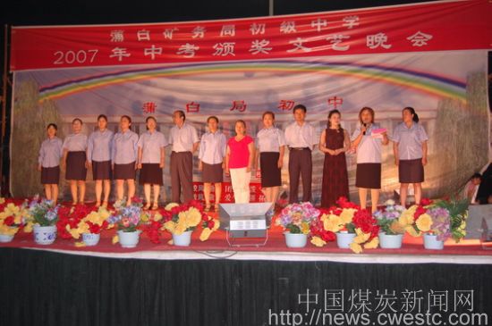 本网讯 7月25日晚,陕西蒲白矿务局技工学校文化广场灯火通明,洋溢着喜庆的气氛,这里正在举行“蒲白矿务局初级中学2007年中考颁奖文艺晚会”,十五名上重点线的学生、家长和局初中的先进教师分别受到表彰。矿区教育界的老领导、老教师、前来送贺信的各单位领导、初级中学初一、初二前十名学生的家长也应邀参加了晚会。