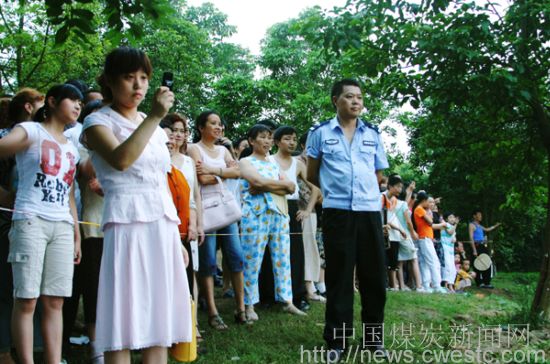 图6:洪灾牵动万人心。为防止意外,保护群众安全,公安民警在思源广场后面半山上拉起了警戒线。