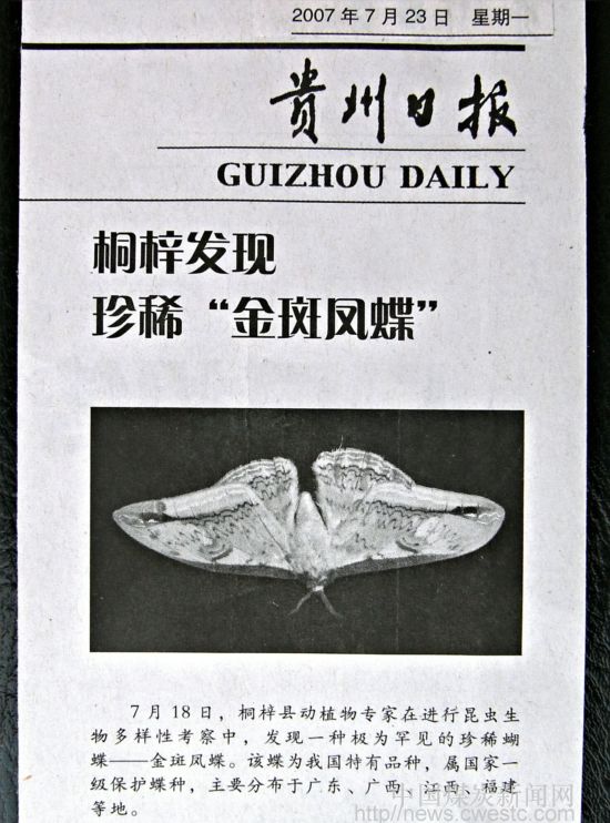 每到花开时节,办公室的房前楼后蝶舞翩翩;那五颜六色美丽的翅膀往往令我情不自禁按动相机快门。而我于7月中旬拍摄的一只蝴蝶与某报报道的一只珍稀蝴蝶(如第二图)十分类同。 7月底不期发现2007年7月23日《贵州日报》刊载的一篇题为《桶梓发现珍稀“金斑凤蝶”》的报道,称:金斑凤蝶是一种极为罕见的珍稀蝴蝶,为我国特有品种,属国家一级保护蝶种,主要分布在广东、广西、江西和福建等地。报道中的图片虽是黑白的,但通过对蝶翼花纹和细部特征细细对照,我自信,我用照相机记录下的这只蝴蝶与所报道的“金斑凤蝶”属同一蝶种。而在我隐隐约约的印象里,在盘县这个地方,往年时不时会遇见这种蝴蝶;这不,今年又遇见了,而且记录了下来。 是否实属同一蝶种,还有待考证 谨以此共享。