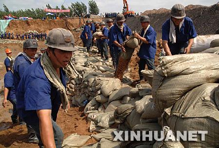 8月21日,抢险人员在山东“8·17”溃水事故现场抢修、巩固用于堵口的堤坝。 新华社记者徐速绘摄 新华网山东新泰8月21日电(记者 邓卫华、王志)山东“8·17”华源煤矿事故被困矿工命运牵动着无数人的心,全国总工会紧急拨款,煤炭系统开始捐款……与此同时,各项救援被困矿工的工作正在紧张有序地进行。 全国总工会劳动保障部部长汪忠汉21日在接受记者采访时说,全国各级工会十分关心山东此次事故的抢险救援工作,全国总工会决定紧急拨款100万元支持此次事故抢险救援工作。 目前,山东省总工会、山东煤炭总工会已分别拨款50万元用于事故抢险救援工作;泰安市和新泰市工会也拨款30万元支持事故抢险。事故抢险指挥部还收到了来自中煤集团的100万元捐款。 与此同时,各项救援工作正在紧张进行。21日中午,记者在华源煤矿三立井看到,来自中煤集团两台排水量分别为1000立方米/小时的大马力水泵在紧急安装中。由于井口原有的井架只有12米,而起吊这套抽水设备需要22米的井架,再加上老井架本身并不牢固,需要安装新的井架,第一台排水量1000立方米/小时的水泵何时能开始排水尚不清楚。 记者在救援现场看到,救援人员有的在忙着抽水,有的在忙着钻井,有的在调试安装排水泵,有的在忙着防渗漏……各项救援被困矿工的工作正在紧张有序地进行。正在现场参与救援的一位矿工告诉记者:“同为矿工,只要有一点希望,我们就会付出100%的努力,再苦再累都值得。” 国家安全生产专家组专家程卫民告诉记者,为加快抽排水进度,已经运抵事故矿区的4台钻井机械,计划总共打10个钻孔,安装10台抽排水泵,预计每个钻点每小时可抽排120立方米的井下积水。 截至21日15时,华源煤矿井下积水水位已下降至+68.1米(华源煤矿地面标高为+175米),比井下积水最高水位降低了24.5米,但下降速度明显放缓。井下积水水面离最有可能在井下-30米处的14名被困人员已不足100米。