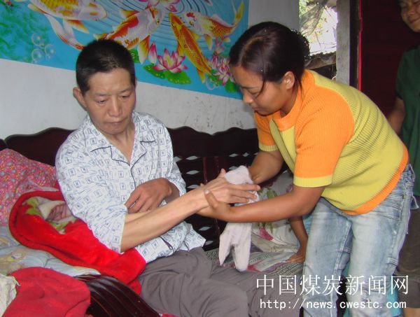 在贵州盘江煤电集团公司土城矿小云尚家属区66号楼,谈起熊桂英、郑玉芳两妯娌,邻居们无不交口称赞。她们悉心照料瘫痪在床的公公段家信的事迹在街坊邻居中传为佳话。“给公公檫背、洗澡、端送大小便、喂饭吃,两个儿媳妇比亲生儿女还要孝顺啊!”说起两个贤惠的儿媳妇,50岁的婆婆吴玉珍感动得老泪纵横。 去年4月份,不幸降临到了段家信家这个原本幸福和睦的家庭。一天外出散步时,仅仅因为摔了小小的一跤,使原本身体强壮的他再也没能站起来。送到医院检查治疗了多次,都没有确诊到底患了什么病,有的说是脑瘫,有的说是脑溢血,但是最终都没能确诊。最初的时候,在子女的搀扶下,老段还能外出大小便,但是随着病情的持续恶化,最后造成了失语并瘫痪在床,大小便经常失禁。 家里的顶梁柱一下子倒下了。巨额的医疗费用和沉重的护理压得这个家庭喘不过气来。尽管矿上在力所能及的情况下多次给予了他家物质和经济上的帮扶,但是这也仅仅能解决一时之急。特别是对老段的护理成了一大问题。“绝不能让父亲因为瘫痪而受一点苦”。大儿媳熊桂英和小儿媳郑玉芳主动承担起了照顾公公的重担。老段的两个儿子段春来、段宝春和小儿媳都在盘北洗煤厂运销科上班,每逢轮到休班,他们都会见缝插针地赶回来为父亲进一份孝道。由于大小便失禁,老段睡的床单和衣服经常被粪便染得到处都是,这时,两妯娌没有推诿和迟疑,打来热水、拿来毛巾,为公公擦背换洗,有时一天要重复多次,但是他们没有一句怨言。为了不让卧床的公公身上长薅疮,两妯娌经常轮流给老段翻身,婆婆年纪大了,她们又主动为公公洗澡。端送大小便她们也争着抢着去做。婆婆吴玉珍眼含热泪对笔者说,有这么好的两个儿媳妇,这是我前世修来的福分,我感到很满足。为了照顾父亲,现在小儿子段宝春和儿媳郑玉芳打算从盘北选煤厂调回土城矿煤质科工作,虽然工资收入和工作环境可能会改变,但是只要能照顾父亲,苦点累点他们的心里也满足。住66号楼的邻居们说,作为一对年轻的儿媳妇,能够给公公洗澡擦身子,还要端送大小便,真是难能可贵,这样孝顺的儿媳妇难找了。 从去年4月份到现在,600多个日日夜夜,熊桂英、郑玉芳两妯娌用实实在在的孝心书写着一个大大的爱字,诠释着中国几千年孝亲敬老的优良传统。在为这种感人至深的爱心孝行叫好的同时,我们也祝愿老段在这种挚爱亲情的呵护下早日康复。 图为大儿媳熊桂英正在给公公擦手洗脚。