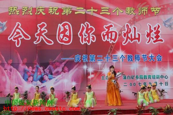金秋九月,天高云淡。在党的十七大即将召开前夕,迎来了我国第23个教师节,2007年9月10日蒲白矿务局教育培训中心在矿务局文化广场举办“今天因你而灿烂”大型庆祝活动。
