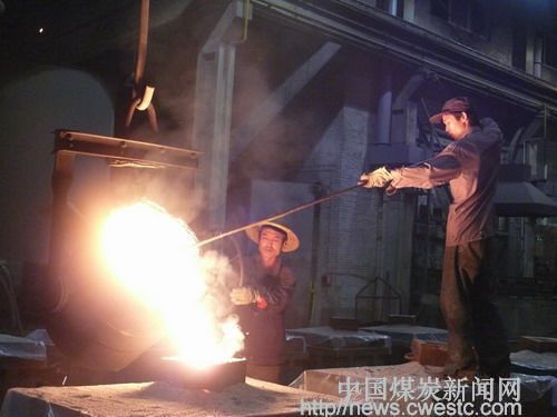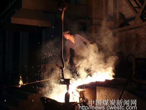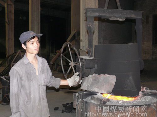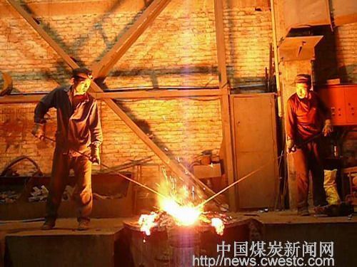 (2)-沸腾的钢水倒进钢包,吊装到砂箱上方,要准确的罐装到浇冒口中,三通公司铸造车间浇筑班班长李建武与近在咫尺的沸腾钢水保持着“亲密接触”,顺利的完成浇筑过程。