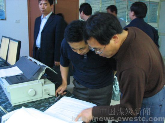 刘维东副局长(中)在该矿调度室了解目前矿井生产情况