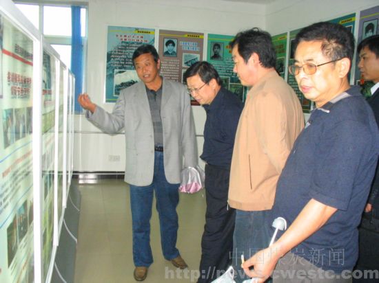 在该矿矿井模型前,矿长刘生江(右二)向视察组介绍矿井概况