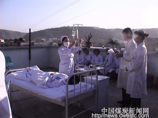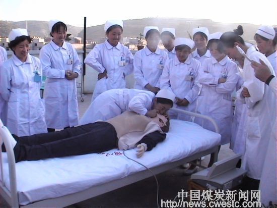 本网讯 9月16日,在铜川矿务局供应处骨科医院的三楼平台上,一名“男子”躺在病床上,一群白衣护士轮流上前为“他”吹气、压胸进行紧急救治,原来这是供应处骨科医院正在举行护理技术比武的心肺复苏比赛的一个镜头。“男子”是该院花费万元投入的人体模拟机。