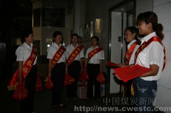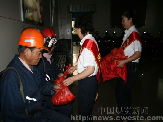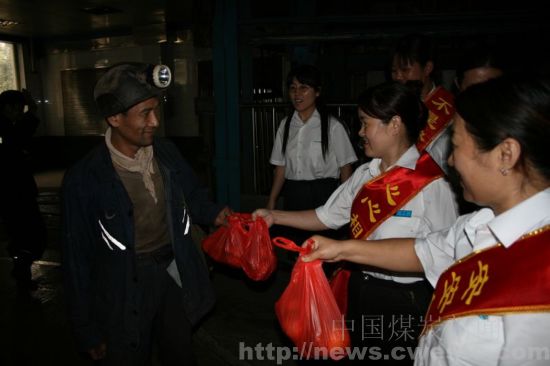 本网讯 农历八月十五日是中国人民的传统中秋佳节,山东济宁兖矿集团杨村煤矿女工、家属大嫂们中午1:00来到井口慰问一线下井的矿工们,送上中秋节的慰问品,提醒他们节日期间不忘安全生产。