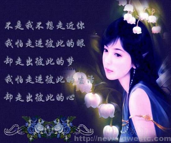 总在寂静的午夜 打翻时光 那些青葱的岁月 那些如花的笑嫣 那些被搁浅的爱恋 透过橘红的灯光 凌乱 一地凄凉 熟悉的往事,陌生的你 来来往往 ![]() 宛若一只翻飞的蝴蝶 跃过记忆的栅栏 如果可以 就让我做那个临水的伊人 在你的诗里 种桃 种柳 种春风 然后慢慢的 慢慢的静下来 独自开花 独自流浪 人生啊,总有太多的事情 无法掌握 无法预见 一如此刻的我们 只能在别人的故事里 上演 与已无关的悲喜 无法相见 不如怀念……