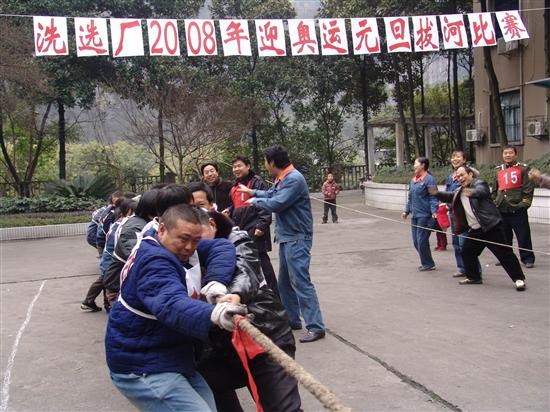 “加油、加油!”2008年元旦, 重庆金鸡岩洗选厂办公楼前员工家属的助威声此起彼伏,气氛十分热烈。原来,厂工会在组织大家开展“迎奥运庆元旦”拔河比赛。鼠年到来之际,洗选厂灯笼高挂、彩灯炫丽,布置一新,呈现出一派祥和喜庆的节日气氛。 为让员工过一个祥和快乐的新年,厂组织了丰富多彩的娱乐活动,送新年贺卡、斗地主、桥牌比赛等,每项活动员工们都踊跃参加,比赛场面精彩热烈, 喜闻乐见的娱乐形式,受到了大家的欢迎。