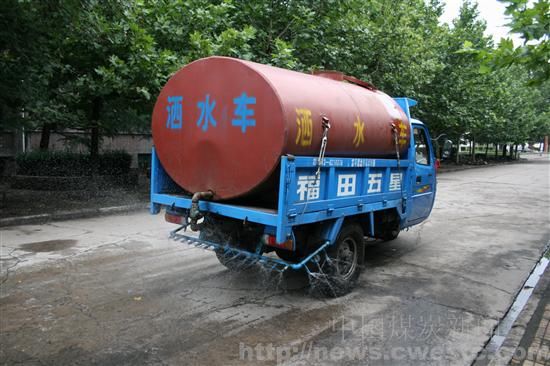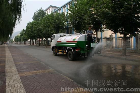陈家山矿物业公司工作人员利用新购置的专用洒水车进行路面降尘洒水情景