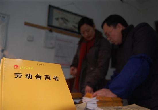 本网讯 1月8日上午,安徽淮北矿业桃园矿采煤一区办事员田刚(左)在工资科领取本单位职工《2008年劳动合同书》。按照《劳动合同法》要求,该矿及时与1000多名合同到期的职工签订新的《劳动合同》。新《合同》由淮北矿业依据《劳动合同法》制订,增加了工作地点、工作时间、休息休假等条款,对稳定企业劳动用工,保障劳动者权益具有重要作用。