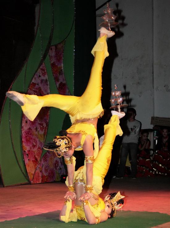 中国铁路文工团杂技团、中国国际吴桥杂技艺术节银狮奖获得者庞敏、周艳杰表演的杂技《滚杯》精彩刺激,让观众大饱眼福