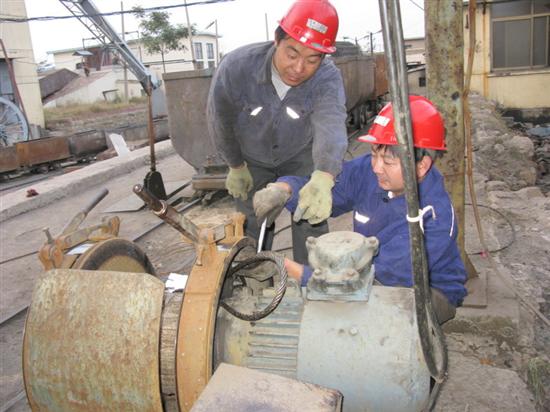 (图为该矿机电人员对发现隐患的绞车钢丝绳进行更换)