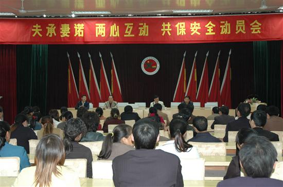 3.用爱心呼唤安全,用亲情感染职工,徐家沟矿开展“夫承妻诺,双心互动,共保安全”活动。这是动员大会会场。