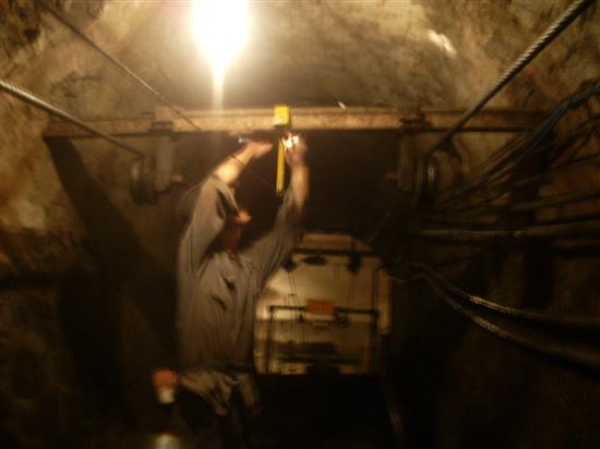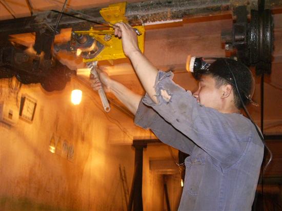 该装置在架空人车运行的340米巷道中,安装了一条钢索及2组停车按钮,与架空人车的限位装置串联在一起。在行车过程中如果遇到紧急情况,乘车人只要轻轻一拉停车钢索,机构马上动作,架空人车立即停止运转。该装置的安装,有效解决了紧急情况下架空人车司机未能及时停车的情况,保证了乘坐架空人车上下班的职工的人身安全,效果良好。 技术人员在安装停车按钮