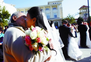 昨日,与另十对网恋成功的情侣一起,吴介琴与58岁的蒋晓辉走进婚姻殿堂。“你愿意做我妻子吗?”吴介琴单膝跪地向蒋晓辉求婚时,在场亲朋给予3分钟的掌声。吴是中央美院退休教授,蒋是成都铁路系统退休员工。他们通过一家婚恋网相识后一见钟情。婚后,吴介琴将入赘四川。 本报记者 孙纯霞 摄