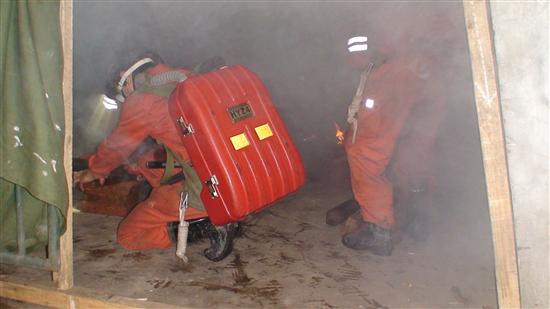 本网讯 10月28日上午,川煤芙蓉珙泉煤业公司救护队操场浓烟滚滚,原来这是该队在进行高温高浓烟演练。模拟巷道外秋意渐凉,巷道内浓烟滚滚,泼上油污的棉纱噼啪作响,温度高达50摄氏度,队员们佩带呼吸器在这环境中呆上半小时,其间还要完成锯圆木等工作任务。队长吴勇告诉记者:训练是为了增加队员体能,提高矿井灾变处置能力。