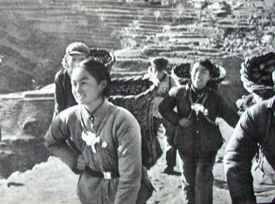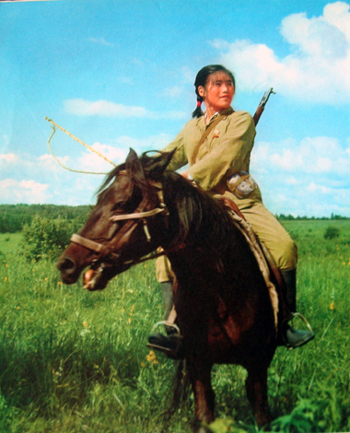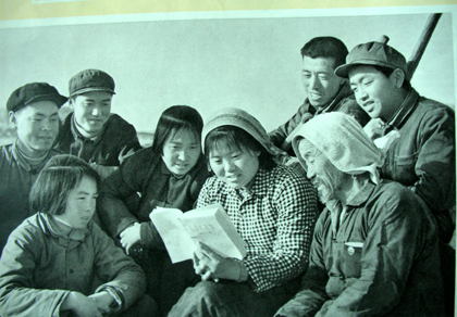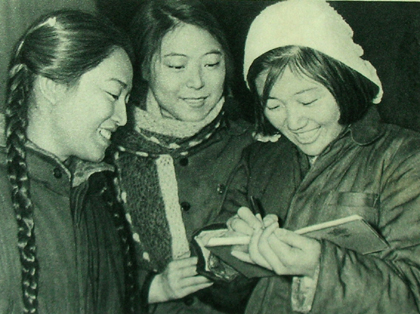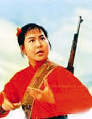 但毕竟,女性,是个美丽的性别,即使在那样的时代,新闻或图片记者,也愿意将美丽的女性装入镜头,以增加画面的色彩感。 不过,那时的发稿要求,是有着特样的审美标准的。电影《海霞》中,主人公因为漂亮些,而且多少有些城市女性的脸相,因而倍受折腾,遇到百般刁难。在那么一个年代里,政治的要求,已经渗透到审美的标准里,因而,出现在主流媒体(也只有主流媒体)上的年轻女性的“美丽”,一定要是胖墩墩、黑里透红,强壮有力、铁姑娘式的,大多数其实也是“八个样板戏”女主人形相的翻版。这里我们先看看样板戏的几个女主角的照片,也就知道当时官方所推崇的女性美丽是个什么模式了: