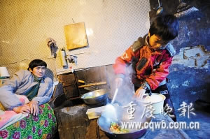 故事导读 父亲瘫痪,母亲离家,11岁的彭小林从5岁起,就肩负起照顾爸爸的重担,撑起这个家。 但他不能同时兼顾上学和照顾爸爸,因此,带着爸爸读书,成了他最大的愿望。 想带爸爸上学 中午放学了,彭小林第一个冲出教室。不到3分钟,他就回到位于学校旁边的家了。瘫痪在床的爸爸正等着他哩,彭小林麻利地做好饭……待他将碗洗净后,离下午上课还有十多分钟,他不慌不忙向学校走去…… “小林,这是给你的12岁生日礼物——可以天天照顾爸爸。”途中,一个让彭小林觉得很亲近、却怎么也想不起是谁的人走过来对他说。 彭小林开心地笑了。 一切不过是场梦。 “丁零零——”彭小林猛然坐起。蒙胧中,他看了看同寝室同学的闹钟,(昨日)早上6点半——这铃声是学校的起床铃声。 这样的梦,彭小林不是第一次做,本月26日,就是他12岁生日。但是,在记忆里,自己根本就没正经过过生日,也没得到什么生日礼物——除了去年从已和爸爸离婚的妈妈那儿得到20元钱。那次,他兴奋得几天没睡好觉,用这些钱给爸爸买了两盒消炎药。 想到爸爸,彭小林叹了口气,迅速穿衣洗漱,开始了一天的生活。 彭小林是重庆城口县河鱼小学6年级学生,他1岁时,家里的顶梁柱爸爸在山西煤窑挖煤时受伤,从此腰部以下全无知觉。5岁时,妈妈和爸爸离婚,他便开始撑起这个家。 读好书,每天中午和晚上回家为爸爸做饭、照顾爸爸,是彭小林最重要的两件事。可自4年级起,学校就要求上晚自习,彭小林不得不开始住读。他也想到在学校附近租房子安顿爸爸,可租房子要钱。因此,这个愿望便只能在梦中实现。 孩子当家六年 彭小林的家在河鱼乡河鱼村2组,距学校要走20多分钟山路。快12岁的他身高仅1.3米,体重不足25公斤。在他记忆中,妈妈是那么模糊——虽然早已再婚的妈妈有时会来看他和爸爸,还会给点钱,买些东西。 他至今不能确定,梦中那个送他生日礼物的人,到底是不是妈妈。每当看到别的孩子和爸爸妈妈在一起时,他就从心底生出一种羡慕,甚至嫉妒。 爸爸受伤时的情形,彭小林没一点印象,却清晰记得妈妈在照顾爸爸4年后离家那天,爸爸痛苦地瘫在床上,用手使劲捶着已萎缩的双腿,用指甲掐着毫无知觉的大腿,然后拥着彭小林放声大哭。这是彭小林唯一一次看到爸爸哭。那年,他5岁。 爸爸彭花权将一辆废旧自行车改装成一个轮椅,用一个装有铁钩的木棍将自己挂在床上方横梁上,然后就能自行慢慢挪到轮椅上,直到2003年,政府为他送去一个崭新的轮椅。彭小林总是事先将煮饭的锅放到炉子上,再将菜洗净切好,做好准备工作后,等爸爸坐着轮椅来炒菜,他就在旁边学。不到6岁,他就能自己做饭了。 但自妈妈一走,爸爸就突然不吃肉了,甚至很少喝水。“我大小便都在床上,吃了肉要增加解大便次数,我不想增加儿子的麻烦。”彭花权说。 “我也不爱吃肉,习惯了。妈妈走后,我们吃饭吃菜全靠爷爷奶奶种,从没买过肉。” 但彭小林觉得“学校那个不要钱的洋芋片炒肉还是好吃”——住读后,学校免去彭小林一切费用,每周会供应两道荤菜。 每逢过年过节,彭花权都会赶儿子去妈妈或大伯家吃点好的,自己则一个人在家。拗不过爸爸的彭小林总是吃了饭就回来,从不在外过夜。 昨日,记者在彭小林那幢土房里看到,这个家所有家具就是两张床、一张桌子,一台爸爸受伤前买的彩电是家里唯一的电器。家虽破旧,但整洁干净。彭花权的床头就是水龙头和下水道,床上放着一根两米长的竹竿,一头装着个铁钩,彭花权可躺在床上用它“拿”东西。家里的桌子、炉子脚下都安有轮子,不用费多大劲就能钩到床边。这些都是父子俩改装的。 住校前,彭小林包揽了家里洗衣服、做饭、扫地等家务,每天早上5点钟就起床,做好一天的饭,下午放学后又匆匆赶回家。 天冷了,家里随时得生火,上周星期天,彭小林买了500个蜂窝煤,他用自己的小背篼将煤从场镇背到家里,一次能背20多个、15公斤。他往返了20多次,花了一个上午,才将这些煤背回来。 看到瘦小的儿子满脸和着煤灰的汗水,彭花权痛苦地闭上眼睛。拒绝丢下爸爸 虽然辛苦,但彭小林心目中最满意的生活就是这样,上学、照顾爸爸两不误。因此,当学校要求稍远的学生住读时,他第一次没听老师的话,坚持走读——尽管学校不让他缴任何费用。 但晚自习要上课或评讲卷子,彭小林不得不每天下了晚自习才回家。有好几次,他走在漆黑的山路上,都险些摔到山崖下。10多天后,彭花权强迫儿子住进学校寝室,周末回家。 但彭小林仍会不时抽出晚自习前的时间赶回家,看看爸爸:“爸爸说他能照顾自己,爷爷奶奶就住在我们旁边,有事也可叫他们。但我们分了家的,爷爷奶奶又长期在地里忙……” 有天早晨,彭小林做清洁将轮椅放到堂屋就去上学了,等他下午放学回家才发现,爸爸因够不着轮椅,竟一整天没解手,没吃饭。他连声责怪自己粗心大意。从此,每次出门,他总会反复检查,确保爸爸在家能生活自理。 每个星期天去学校之前,彭小林都会去地里砍回够爸爸一周吃的菜,将菜和爸爸常用的东西放在床边,把屋里收拾得干干净净。每周五回家,他总能看到爸爸坐着轮椅在门口朝儿子回家的方向张望。 彭小林怕下雨,每次在学校看到下雨,他总会想起家里漏雨的房子。前不久,他请村民帮忙将屋顶的瓦翻捡了一遍,才不用为此担心了。 彭小林最开心的是妈妈来看他和爸爸,一