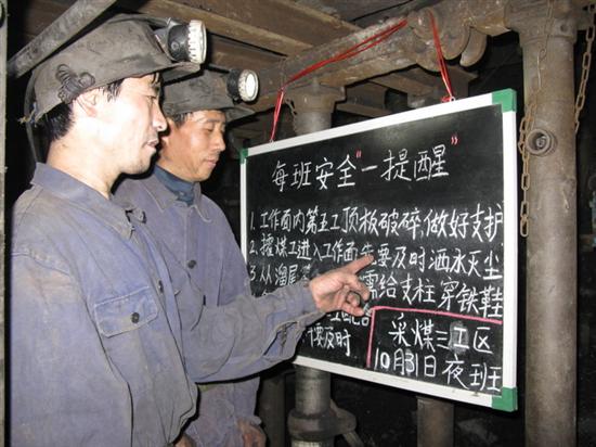 图为该矿采煤工进面前细看在工作面入口处设立的《每班安全一提醒牌板》。