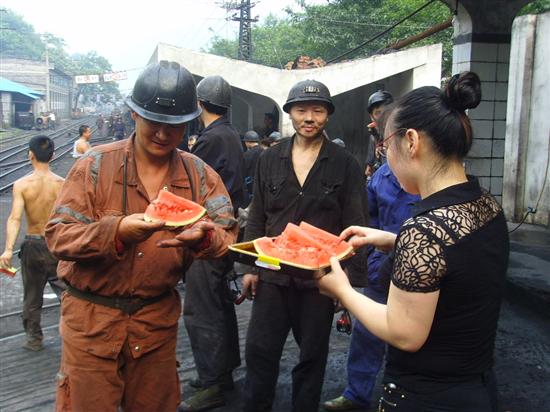以人为本,刚柔并济是三汇一矿抓安全工作的一大特色。在用好制度管理这个刚性措施的同时,亲情感化在安全管理中发挥了不小的作用。矿长倪艳华指出:安全工作的主体是人,党政工团在抓职工群众安全工作中,就应着力建设人性化、亲情化、具有本矿特色的安全文化。党委书记伍卫要求党建部门要经常深入职工、深入区队、深入班组调查研究职工所想、所思、所为,解职工难,暖职工心,保安全生产。矿工会、党委工作部、企业文化办公室,按照工作要求,积极开展下访活动。一次,采煤五队职工反映收入偏低,是队领导有意挤压他。经过党群部门调查了解,不是队领导有意挤压,而是该职工没有完成队下达工作任务,便多次给予谈心交底开导,使这位职工和家属消除了怨气。还有一名掘进工因典型违章受到处罚。由于该他性格内向,对交流谈心不愿配合,对立情绪较大,并到矿有关部门大吵大闹,造成了不好影响。“三违”心理诊所的同志和女工协管会成员在进行家访时发现,该职工有两个未成年孩子,妻子有病,也没有工作。于是,工会的同志根据实际情况一边给予说法教育,一边送去慰问品、困难补助,看望其妻。滴水石穿,温情感化了倔汉。这名同志不仅主动承认了错误,还写了检查,签了安全保证书。 灵活的帮教形式,鲜活的送温暖载体让安全文化显得更加鲜活。职工群众成为了自主保安,互助保安的主角。为进一步推动职工群众安全文化建设步入制度化、规范化轨道,充分发挥工会组织和群监网员安全哨兵的作用,三汇一矿在群众安全工作中实行了学、查、述、树、帮、赛“六字工作法”,强化班组群监员的危害辨识能力,让班组群监员做到“班前事事想清楚、班中流程控制住”,以此提升群监网员队伍的素质,促进了群众安全工作不断向前发展。 图为女工委主任艾小苹为出井职送西瓜